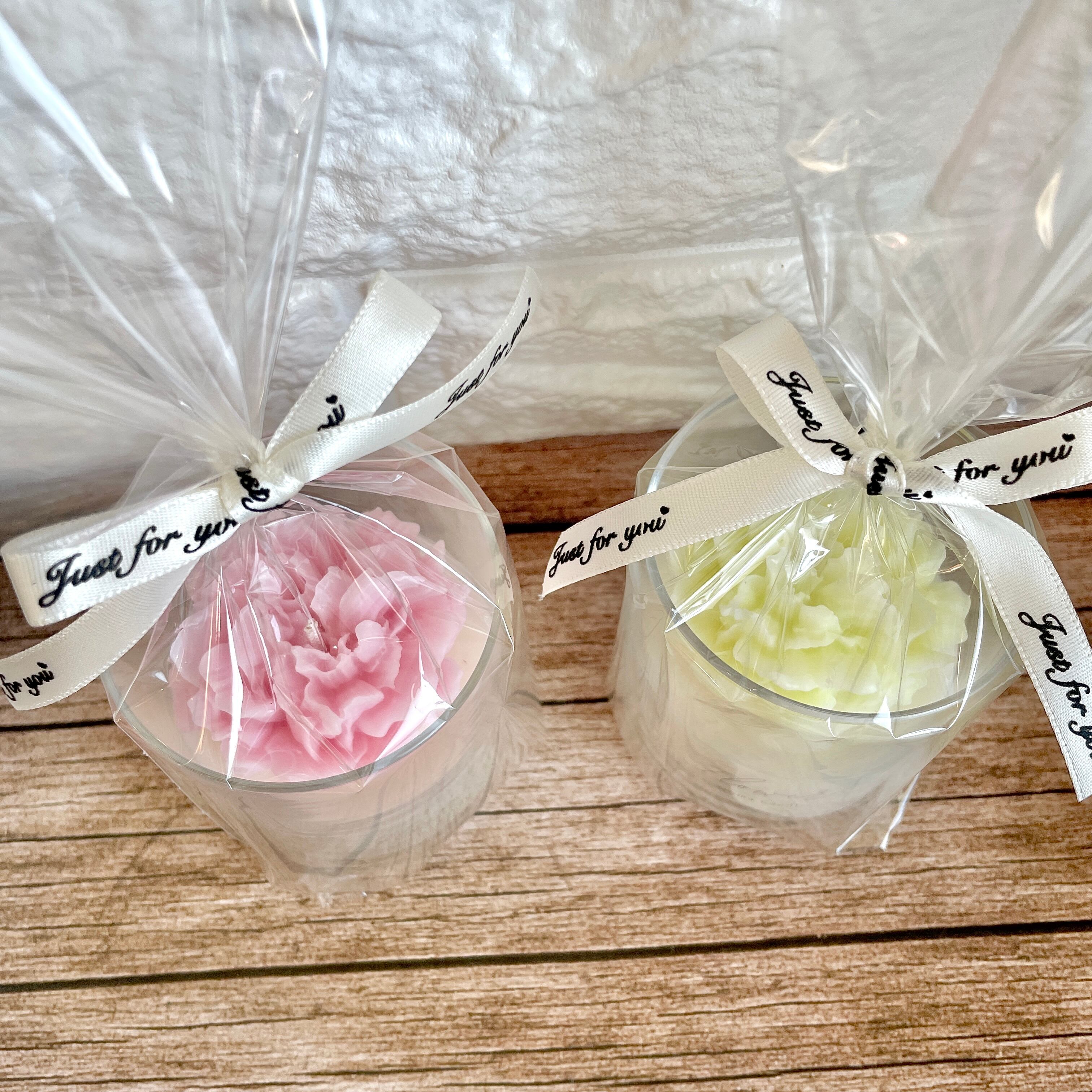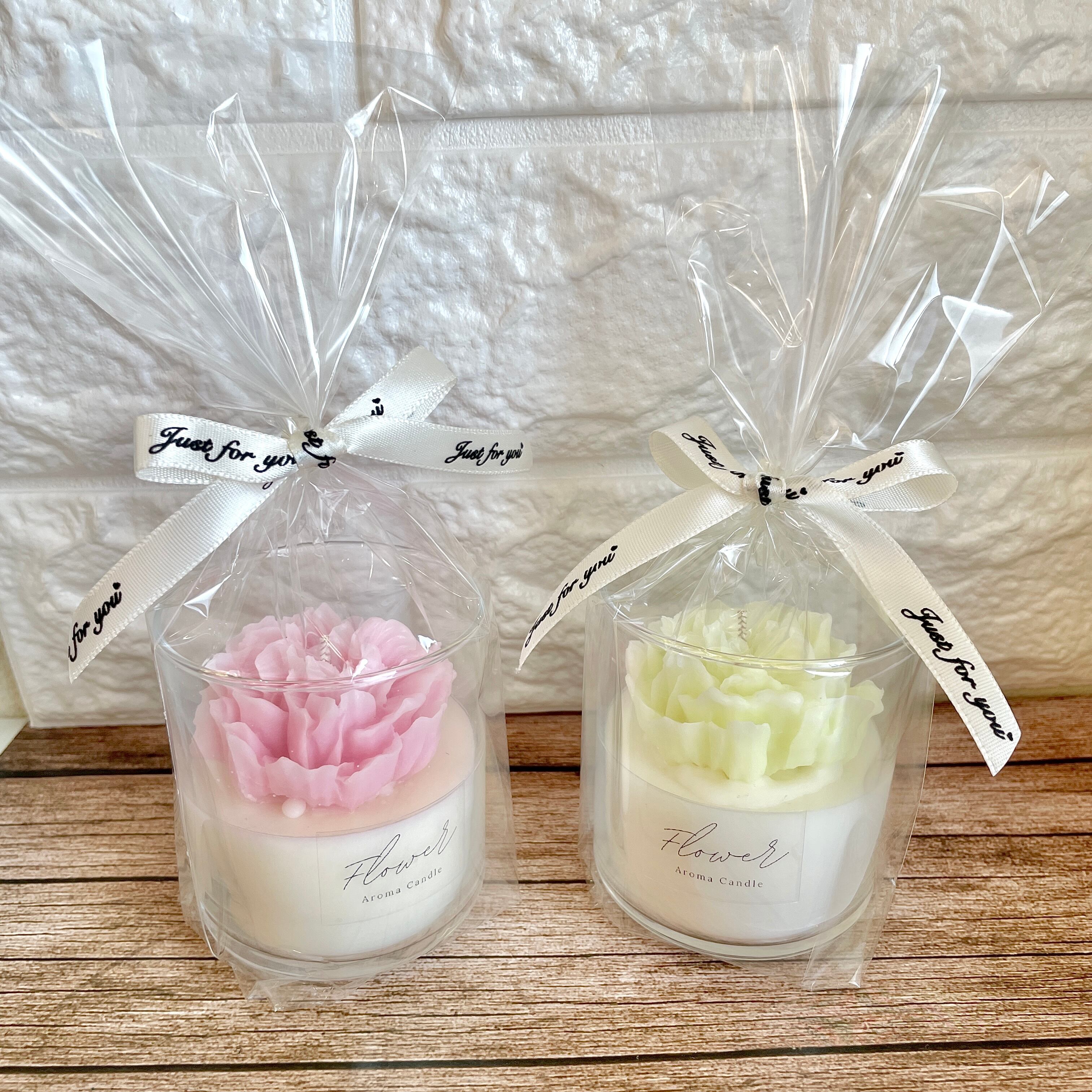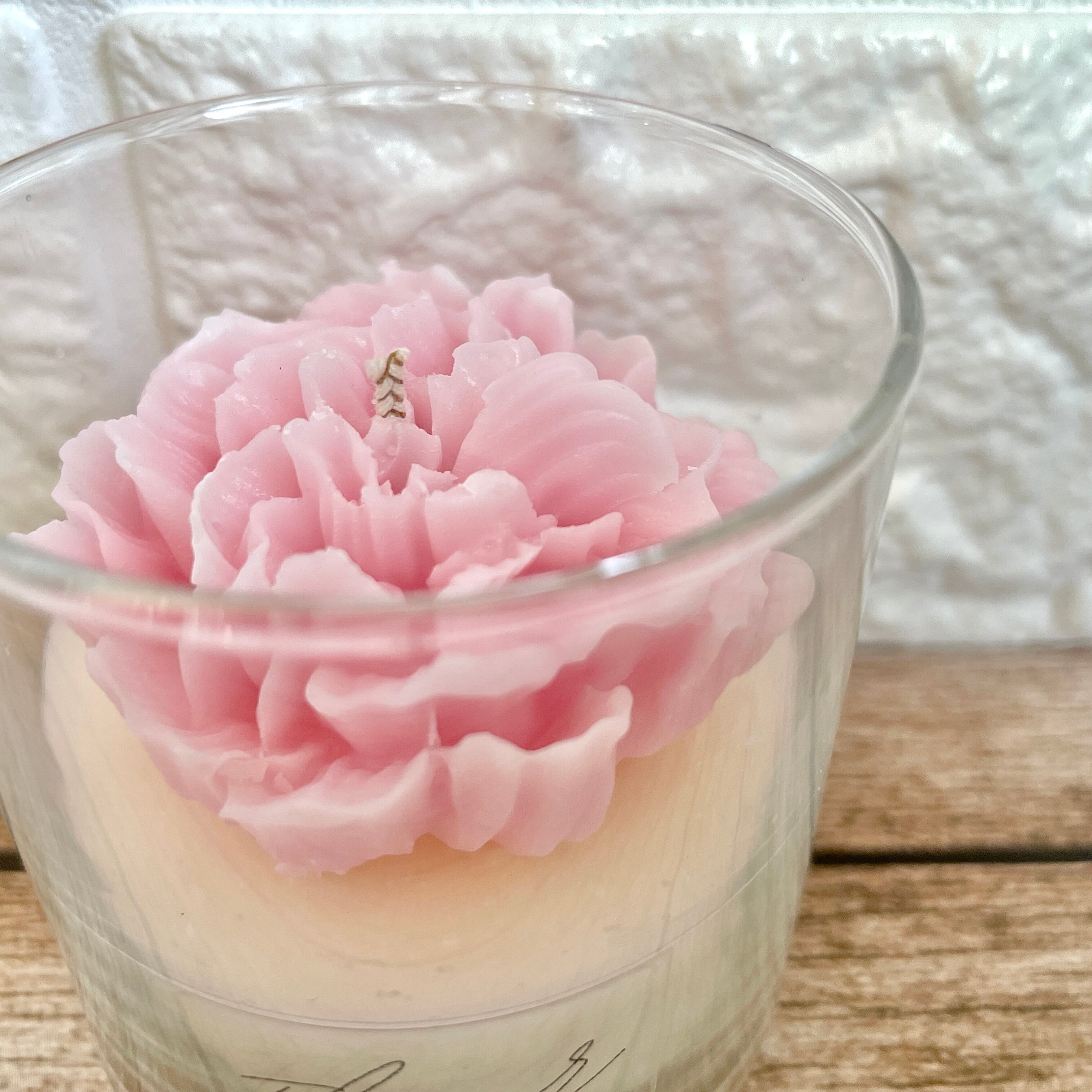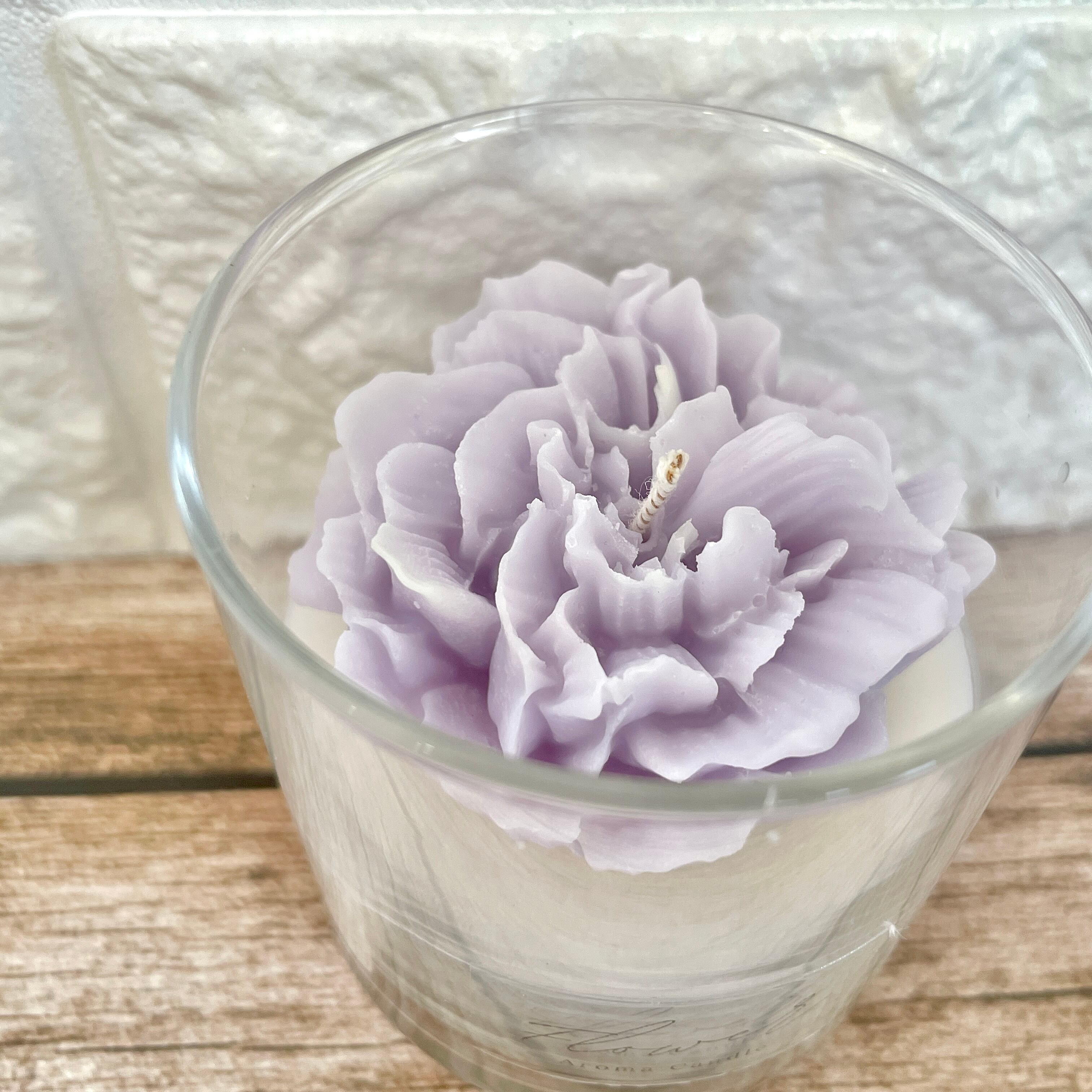 美しい花の形のワックスを上部にあしらった、エレガンスかつ愛らしいアロマキャンドルです。